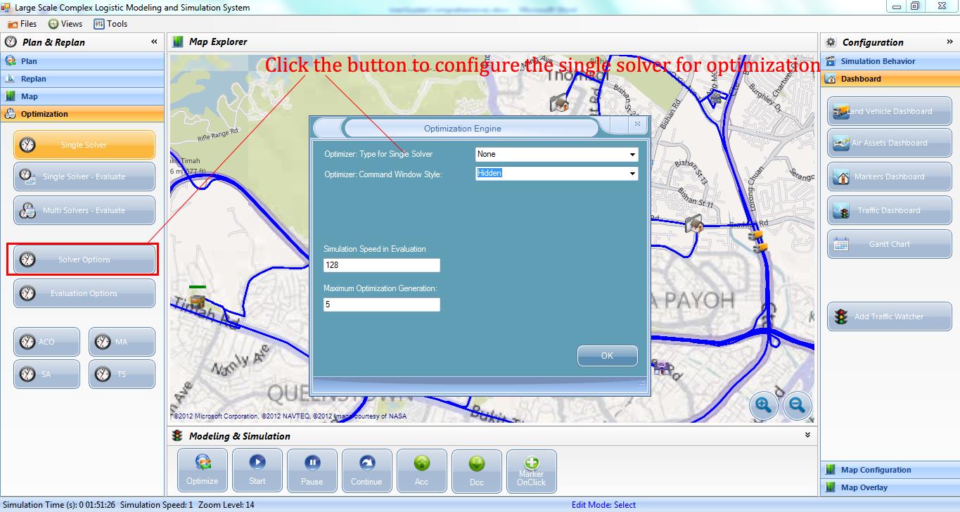 • Single Solver - Evaluate: when this option is selected, a single solver is used for optimization. This solver can be one of the solvers (Memetic Algorithm, Simple Heuristic, Tabu Search, Simulated Annealing, Ant Colony Optimization). The configuration of the single solver is set through the Solver Options button. The result can be obtained relatively quickly using this option, with usually satisfactory result.