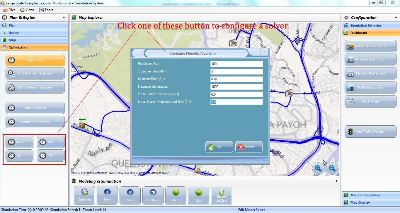 • Optimizer Type: this specifies the type of optimizer used for optimization. For the optimization solver, user can select among Memetic Algorithm, Tabu Search, Simulated Annealing, Ant Colony Optimization. Each of these solvers is configurable, by clicking the Config button next to Optimizer Type which brings up the optimizer configuration dialog.