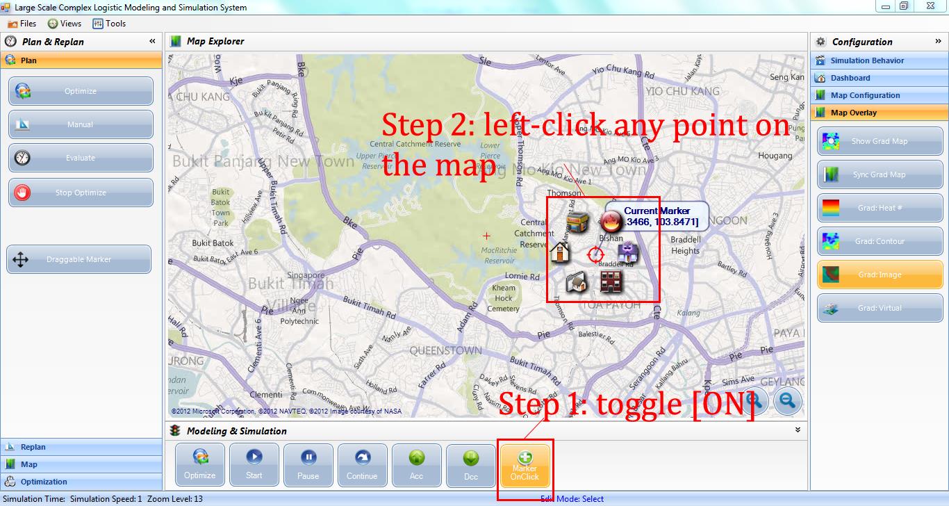 This section shows how to create marker on the LesCaS map. To enable marker creation on the map, toggle Marker OnClick button ON, and then left click on the map. A circular menu will appear as shown in Figure below. To cancel marker creation, click anywhere on the map again. This will close the circular menu.